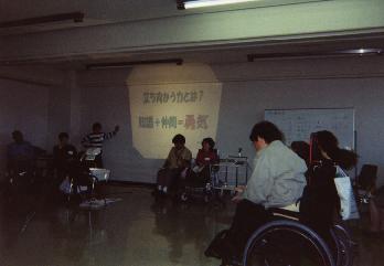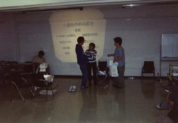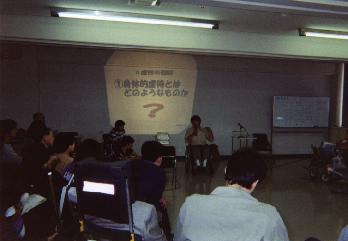 今思い返しても、僕が一番記憶に残っているのはそのシーンです。会場の前方にはインストラクターがいて、その後ろの壁にはOHPが映しだされています。そしてインストラクターを中心に扇状に参加者が座っています。WSもそろそろ終わりに近づいた頃に、上のような展開があったのでした。