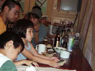 「夏休みだからお父さんもこどもといっしょに」ということで、日曜日に開いたことは、ご案内でもお知らせしたとおりでしたが、残念ながらおとうさんが参加した家族は1組!でした。でも、おとうさん、ワンドリンク付にビールをご指名になり、(写真にビール瓶写ってるの見えますか?)飲みながら?がんばって一緒に楽器作りしてました。えらい!(かな?)