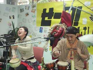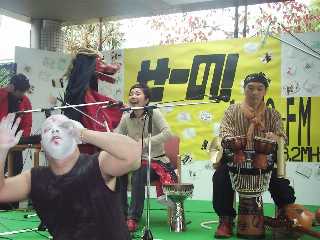 全面協力とはこれいかに!? いつものどんぐり一座による、パン(猫マンマ)、手作り楽器(竹の工房)マッサージ(癒快)は、もちろんのことですが、今回は、なんと!中央ステージでのコンサートを請け負ったのでした。しかも、FM武蔵野による全面生中継だぞ!「ひる猫音楽」の面目躍如であります。