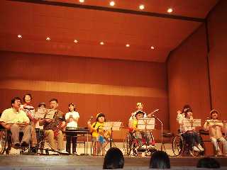 結構お客は入ってたんだけど、会場が立派すぎて?ゆったり座れて、うちのりょうすけ(自閉症)も奇声を発し、大騒ぎの大満足。うしろのTERAさんの息子(ダウン症)も負けじとばかり、うなってます。他にも会場には不思議なうなり?とか、演奏にかまわずひょこひょこあるいてる人とかいて、でも、身体障害のひと中心とした演奏者は、ぜーんぜん気にせずに、気持ち良く歌い演奏して、とってもおもしろかった(って不謹慎?)です。普段、子供達のことで遠慮しまくってる我々としては、大事なところです。障害種類の区別なく、また、健常と障害の区別なく、の世界の縮図を、一瞬垣間見た、っていうところかな?
